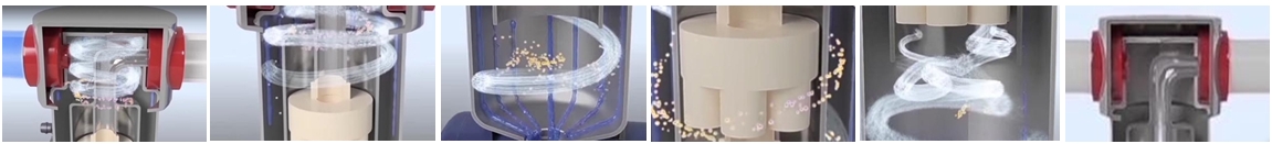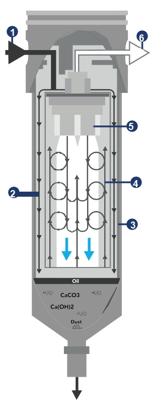 (1) Polluted air enters the port through the primary chamber where the directional changes of the flow cause cyclone rotation of the air